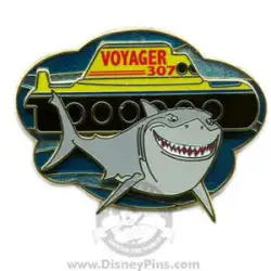 Bruce - Voyager is a Limited Edition (LE) 1000 pin in the Finding Nemo Submarine Voyage Collector Set 8-pin set from the Finding Nemo Submarine Voyage pin series. It was originally released on , 2008 and was available from Disneyland Resort .