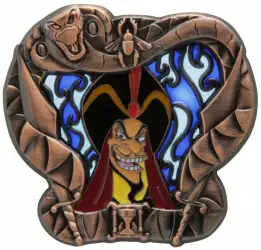 Jafar is a Limited Edition (LE) 400 pin from the Villainous Stained Glass Frames Series pin series. It was originally released on , 2014 and was available from Disney Studio Store Hollywood / Soda Fountain .