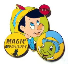 Pinocchio - Pinocchio and Jiminy is a Limited Edition (LE) 200 pin from the Magic Measures 2014 pin series. It was originally released on , 2014 and was available from Disneyland Resort .