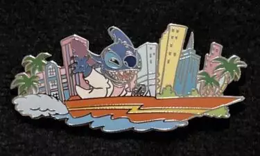 Stitch in Miami is a Limited Edition (LE) 100 pin from the Stitch in US cities pin series. It was originally released on , 2005 and was available from Disney Auctions .