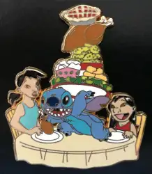 Lilo, Stitch and Nani sharing Thanksgiving dinner is a Limited Edition (LE) 500 pin from the Thanksgiving pin series. It was originally released in November, 2005 and was available from Disney Store US .