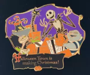 Halloween Town is making Christmas! is a Limited Edition (LE) 100 pin from the Nightmare Before Christmas Story series pin series. It was originally released on , 2004 and was available from Disney Auctions .