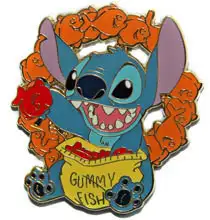 Stitch with Gummy Fish is a Limited Edition (LE) 250 pin from the Candy series pin series. It was originally released on , 2010 and was available from Disney Store US .