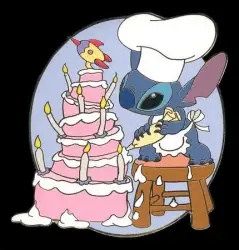 Stitch making birthday cake is a Limited Edition (LE) 1000 pin from the Disney Auctions (P.I.N.S.) pin series. It was originally released on , 2004 and was available from Disney Auctions .