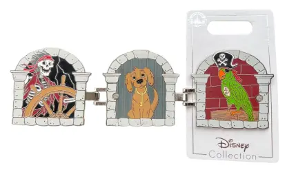 Hurricane Lagoon Skeleton, Jail Dog, and Tattooed Bird Hinged Trifold is an Open Edition pin from the Pirates of the Caribbean pin series. It was originally released on , 2022 and was available from Multiple Sources (WDW, DLR, etc.).
