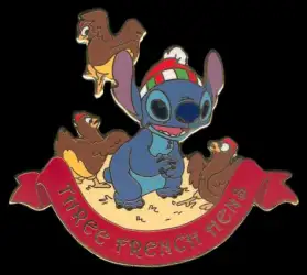 Three French Hens is a Limited Edition (LE) 100 pin from the Stitch 12 Days of Christmas pin series. It was originally released on , 2004 and was available from Disney Auctions .