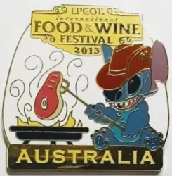 Stitch / Australia is a Limited Edition (LE) 400 pin from the EPCOT International Food & Wine Festival 2013 pin series. It was originally released on , 2013 and was available from Walt Disney World .