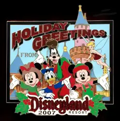 Mickey, Minnie, Goofy, Donald and Tinker Bell is a Limited Edition (LE) 500 pin from the Holiday Greetings Postcard 2007 pin series. It was originally released on , 2007 and was available from Disneyland Resort .