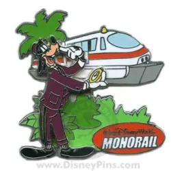 Goofy with orange monorail is a Limited Edition (LE) 1000 pin from the Walt Disney World Resort - Monorail pin series. It was originally released on , 2009 and was available from Walt Disney World .