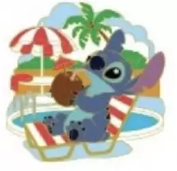 Stitch summer in beach chair is a Limited Edition (LE) 300 pin from the Lilo & Stitch pin series. It was originally released in June, 2012 and was available from Disney Studio Store Hollywood / Soda Fountain .