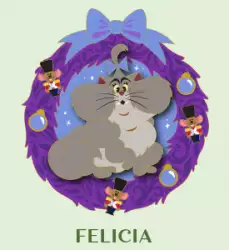 Felicia is a Limited Edition (LE) 400 pin from the Holiday Cat Wreaths Collection pin series. It was originally released on , 2022 and was available from Disney Studio Store Hollywood / Soda Fountain .