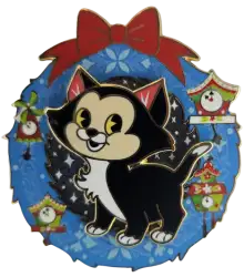 Figaro is a Limited Edition (LE) 400 pin from the Holiday Cat Wreaths Collection pin series. It was originally released on , 2022 and was available from Disney Studio Store Hollywood / Soda Fountain .