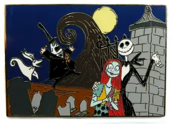 Pin features Jack Skellington , Sally , Zero and Mayor from The Nightmare Before Christmas