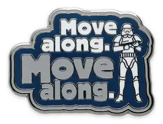 “Move along. Move along.” is an Open Edition pin in the Star Wars Quotes Mystery Set 8-pin set from the Star Wars Quotes Mystery Pin Set pin series. It was originally released on , 2023 and was available from Multiple Sources (WDW, DLR, etc.).