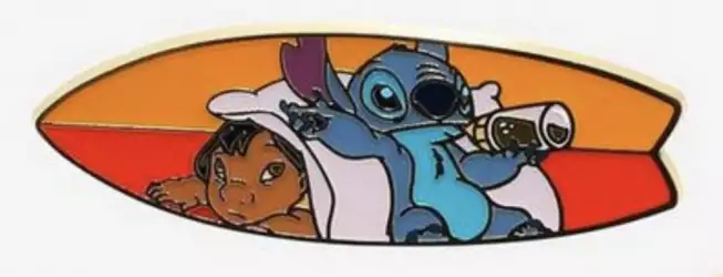 Stitch with Bottle is an Open Edition pin from the BoxLunch - Lilo and Stitch Surfboard Portraits Blind Box pin series. It was originally released on , 2023 and was available from an Officially Licensed Disney trading pin vendor (see description for more information).