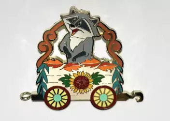 Meeko is an Open Edition pin from the Disney Train Car Blind Box Enamel Pin pin series. It was originally released on , 2023 and was available from an Officially Licensed Disney trading pin vendor (see description for more information).