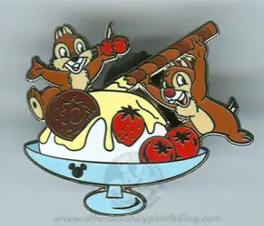 Chip & Dale with Ice Cream is a Limited Release pin from the Cast Lanyard Collection IV - Chip & Dale Food pin series. It was originally released on , 2005 and was available from Walt Disney World .