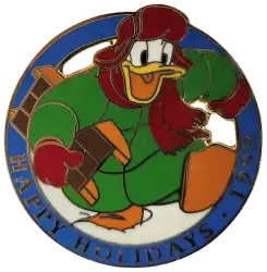 Happy Holidays 1999 - Sledding Donald is a Limited Release pin from the DLR Cast Member Holiday Work Gifts - Christmas pin series. It was originally released on , 1999 and was available from Theme Park Cast Member Exclusive .