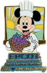 10th anniversary - Chef Mickey holding a basket of grapes is a Limited Edition (LE) 3500 pin from the EPCOT International Food & Wine Festival 2005 pin series. It was originally released on , 2005 and was available from Walt Disney World .
