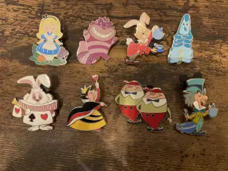 Pin features Alice , The Cheshire Cat , The Mad Hatter , The Queen of Hearts , The White Rabbit , Tweedledee & Dum and The March Hare from Alice in Wonderland (movie)