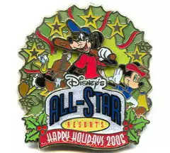All-Stars Resorts - Donald, Goofy, and Mickey Wreath is a Limited Edition (LE) 750 pin from the Resort Holiday Collection 2006: Happy Holidays Wreaths pin series. It was originally released in December, 2006 and was available from Walt Disney World .
