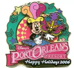 Port Orleans Resort - Minnie Wreath is a Limited Edition (LE) 750 pin from the Resort Holiday Collection 2006: Happy Holidays Wreaths pin series. It was originally released in December, 2006 and was available from Walt Disney World .