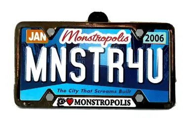 Monster's Inc. - Monstropolis License Plate MNSTR4U is a Limited Edition (LE) 500 pin from the License Plate pin series. It was originally released on , 2005 and was available from Walt Disney Imagineering .