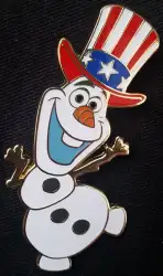 Olaf wearing Patriotic Hat is a Limited Edition (LE) 400 pin from the 4th of July/Independence Day pin series. It was originally released on , 2014 and was available from Disney Studio Store Hollywood / Soda Fountain .
