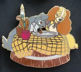 Lady and the Tramp sharing a Meatball is a Limited Edition (LE) 1000 pin from the Disney Auctions pin series. It was originally released in January, 2004 and was available from Walt Disney Studios .