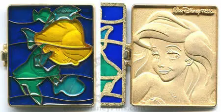 Ariel Flounder Storybook is an Open Edition pin from the Hinged Character Stained Glass pin series. It was originally released on , 2006 and was available from Walt Disney World .