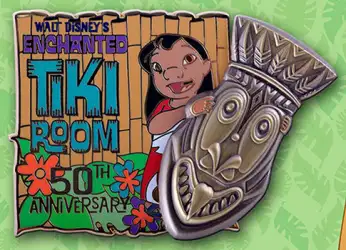 Lilo is a Limited Edition (LE) 250 pin in the Tiki God Mask Boxed Pin Set 4-pin set from the Enchanted Tiki Room 50th Anniversary pin series. It was originally released on , 2013 and was available from Disneyland Resort .