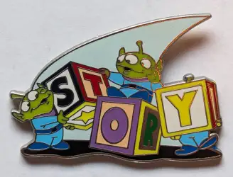 Little Green Men with "STORY" Blocks is an Open Edition pin from the Toy Story Zoetrope Mystery pin series. It was originally released in January, 2009 and was available from Disneyland Resort .