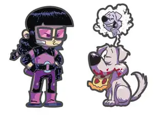 Hawkeye (Kate Bishop) and Lucky (Pizza Dog) is a Limited Release pin from the SDCC 2023 - Marvel Skottie Young pin series. It was originally released on , 2023 and was available from an Officially Licensed Disney trading pin vendor (see description for more information).
