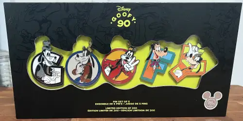 Goofy 90th Anniversary Letters is a Limited Edition (LE) 200 pin from the D23 Expo 2022 pin series. It was originally released on , 2022 and was available from Disney Fan Club .