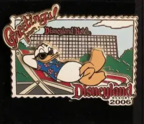 Disneyland Hotel - Donald Duck is a Limited Edition (LE) 1000 pin from the Greetings from Disneyland Postcards 2006 Collection pin series. It was originally released on , 2006 and was available from Disneyland Resort .