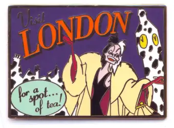 Cruella De Vil - London for a spot of tea! is a Limited Edition (LE) 100 pin from the Disney Auctions Postcard Series pin series. It was originally released in January, 2003 and was available from Disney Auctions .