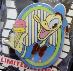 Donald Duck Eating Ice Creamin a Blue and Green Oval Frame is a Limited Edition (LE) 300 pin from the Retro Ice Cream Sign pin series. It was originally released on , 2009 and was available from Disney Studio Store Hollywood / Soda Fountain .