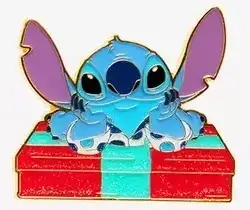 Stitch laying on a present is an Open Edition pin from the Hot Topic - Lilo & Stitch Holiday Morning Mystery Collection pin series. It was originally released on , 2023 and was available from Loungefly .