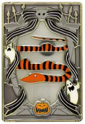 Present Snake is a Limited Edition (LE) 300 pin from the Pink A La Mode (PALM) - The Nightmare Before Christmas Stained Glass Series pin series. It was originally released on , 2023 and was available from an Officially Licensed Disney trading pin vendor (see description for more information).