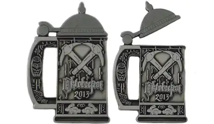 2013 - Hinged Metal Beer Stein is a Limited Edition (LE) 2000 pin from the Oktoberfest pin series. It was originally released on , 2013 and was available from Multiple Sources (WDW, DLR, etc.).