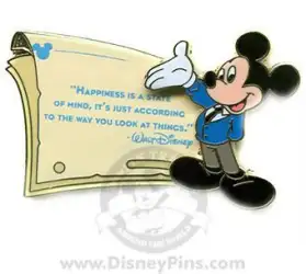 "Happiness is a state of mind..." - Mickey Mouse is a Limited Edition (LE) 1500 pin from the Gold Card Collection - Walt Disney Quotes pin series. It was originally released on , 2007 and was available from Walt Disney World .