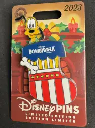 Boardwalk Resort Christmas Stocking - Pluto is a Limited Edition (LE) 2000 pin from the Resort Holiday Collection 2023: Stockings pin series. It was originally released on , 2023 and was available from Walt Disney World .