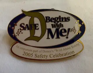 Safe D Begins with Me — Blue and White is an Open Edition pin from the Wild About Safety Collection pin series. It was originally released in January, 2005 and was available from Multiple Sources (WDW, DLR, etc.).