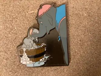 Dumbo getting a bath is an Open Edition pin from the Memorable Moments pin series. It was available from Disneyland Resort .