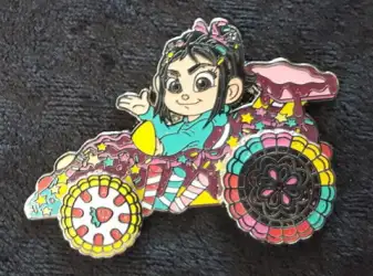 Vanellope von Schweetz is a Limited Edition (LE) 300 pin from the Sugar Rush Racers pin series. It was originally released on , 2015 and was available from Disney Studio Store Hollywood / Soda Fountain .