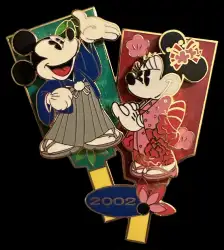 Mickey and Minnie New Years Hagoita is a Limited Edition (LE) 2800 pin from the Mickey & Friends 2002 New Year Collection pin series. It was originally released on , 2002 and was available from an Officially Licensed Disney trading pin vendor (see description for more information).