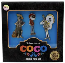 Coco Set is a Limited Edition (LE) 500 3-pin set from the PALM Pixar 3 Piece Disney Pin Sets pin series. It was originally released on , 2022 and was available from an Officially Licensed Disney trading pin vendor (see description for more information).