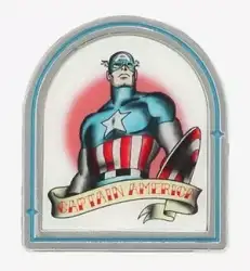 Captain America is an Open Edition pin from the Hot Topic - Marvel Character Tattoo Mystery Collection pin series. It was originally released on , 2023 and was available from an Officially Licensed Disney trading pin vendor (see description for more information).