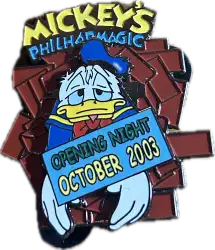 Mickey’s Philharmagic Opening Night October 2003 - Donald going through a brick wall is a Limited Edition (LE) 3000 pin from the Mickey's Philharmagic pin series. It was originally released on , 2003 and was available from Walt Disney World .