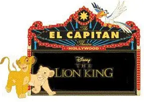 The Lion King is a Limited Edition (LE) 300 pin from the El Capitan Marquee Series pin series. It was originally released on , 2017 and was available from Disney Studio Store Hollywood / Soda Fountain .